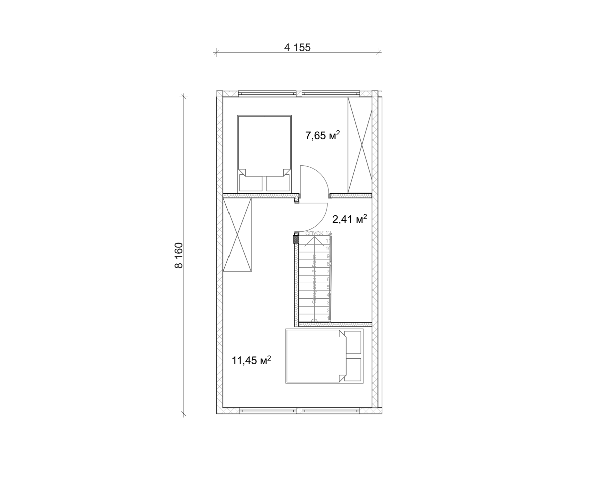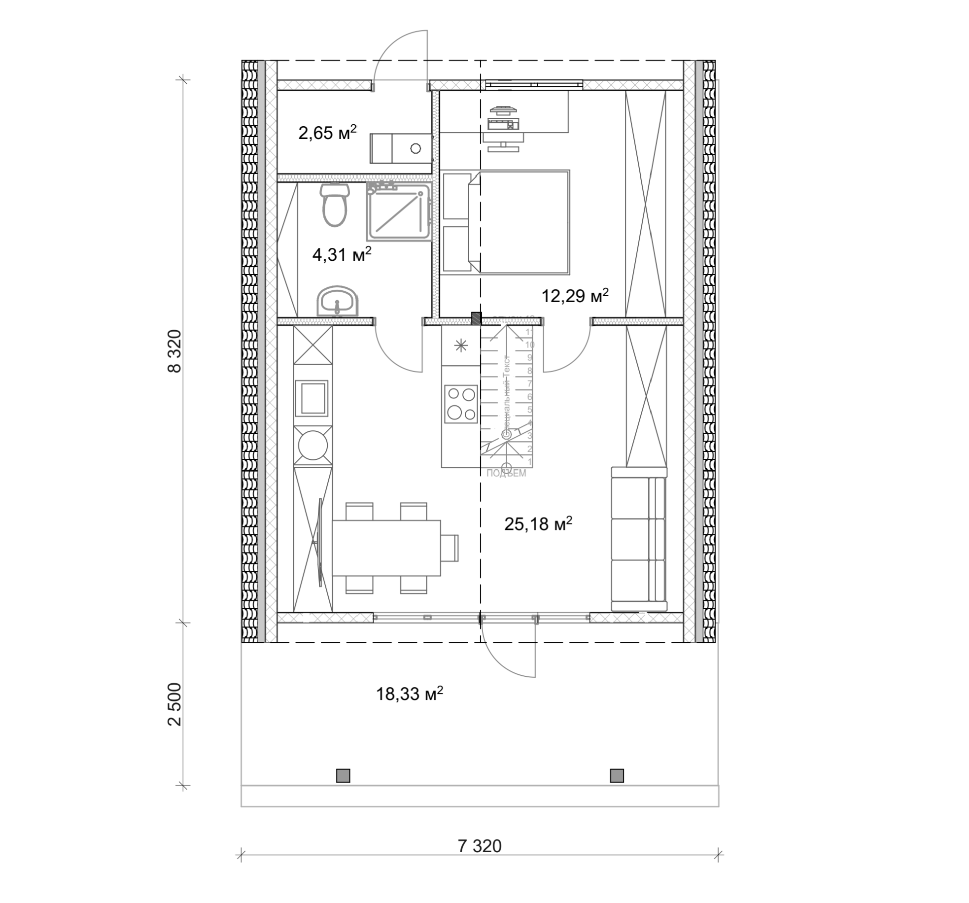 Цей проєкт — сучасний будинок формату A-frame від OnlySip, створений на основі енергоефективних SIP-панелей. Виразний фасад із великими панорамними вікнами та чіткою трикутною геометрією надає будинку унікального вигляду та забезпечує максимальне природне освітлення. На першому поверсі розташована простора кухня-вітальня площею 25,18 м², де зручно поєднується зона приготування їжі, обідній стіл і відпочинкова частина. Тут також передбачено окрему спальню 12,29 м², санвузол площею 4,31 м² та технічне приміщення 2,65 м². З вітальні є вихід на велику терасу 18,33 м², що чудово підходить для релаксу на природі. На другому рівні розташовані дві затишні спальні площею 11,45 м² та 7,65 м², а також невеликий коридор.