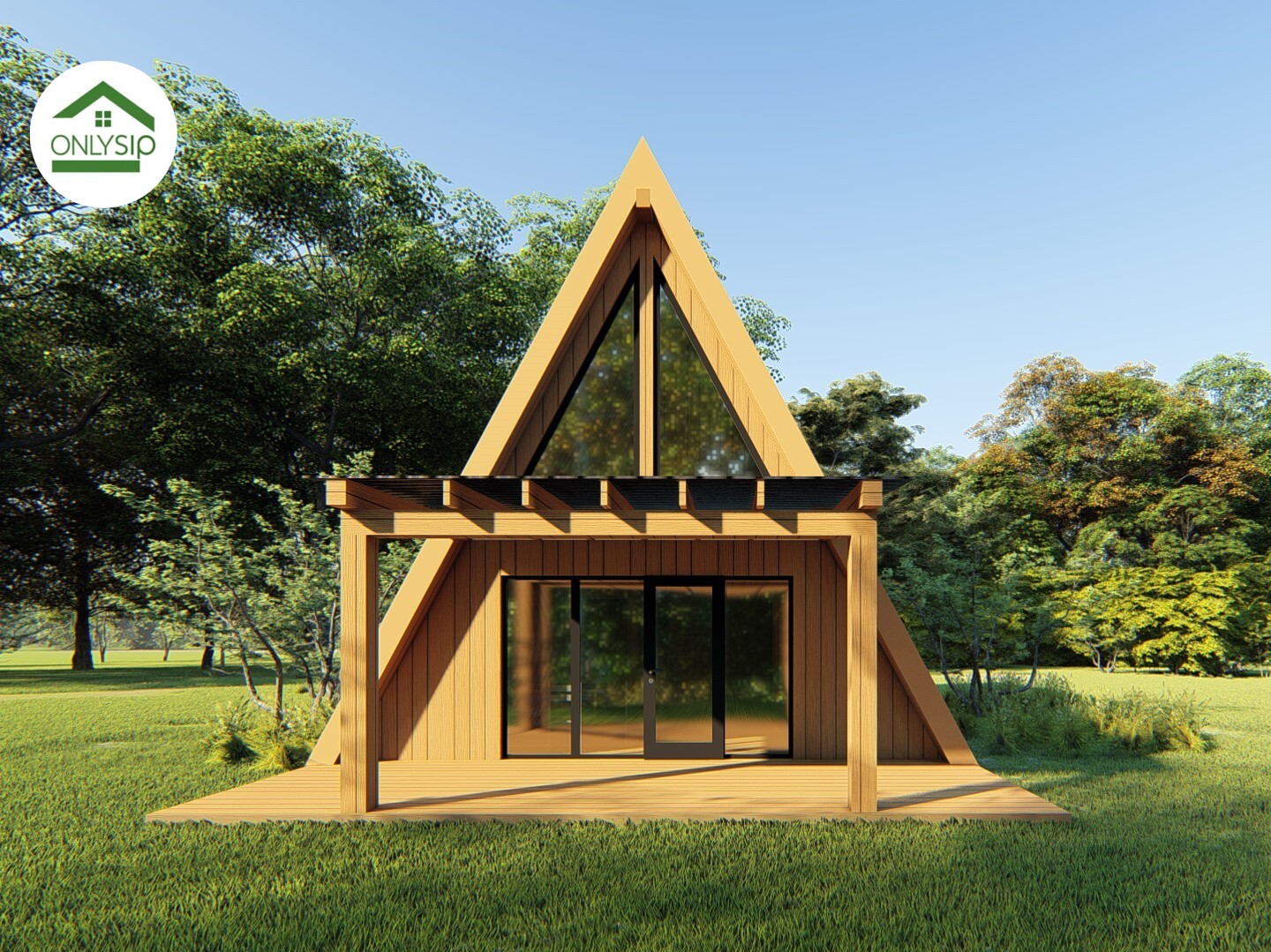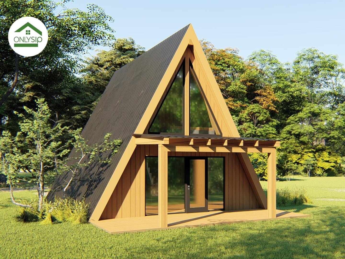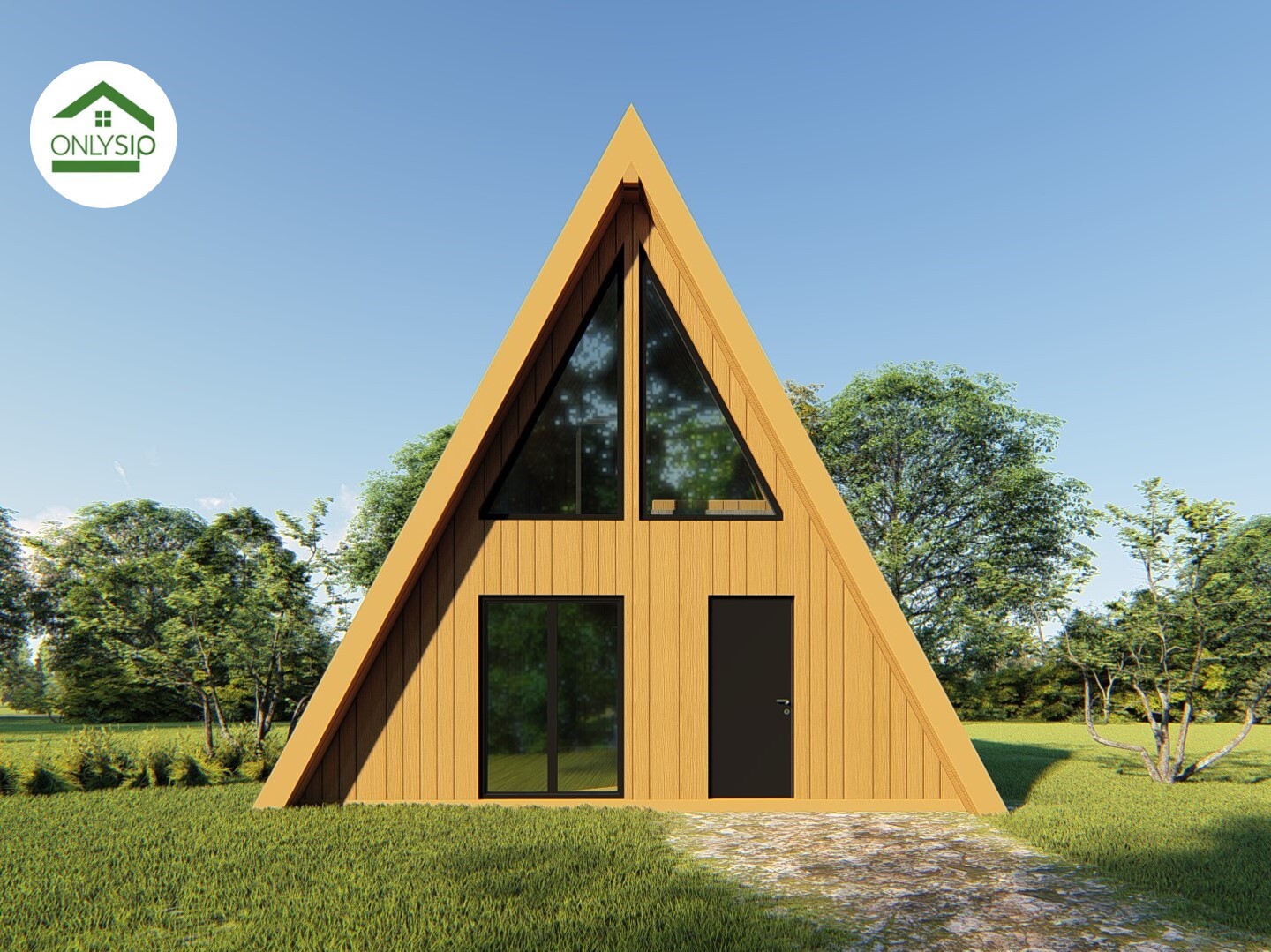 Трикутна форма забезпечує ефектний інтер’єр і створює відчуття простору навіть у компактних кімнатах. Конструкція з SIP-панелей гарантує високу теплоізоляцію, міцність і швидкий монтаж. Проєкт ідеально підходить для заміського відпочинку, орендних шале або компактного житла для поціновувачів сучасної архітектури.