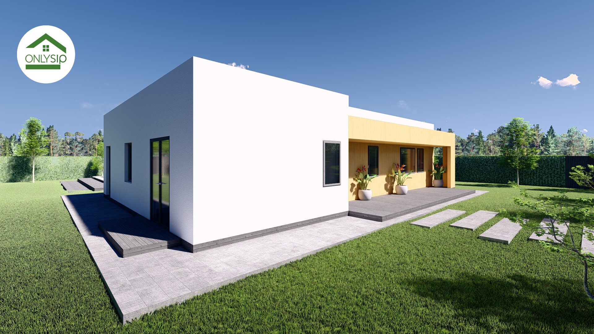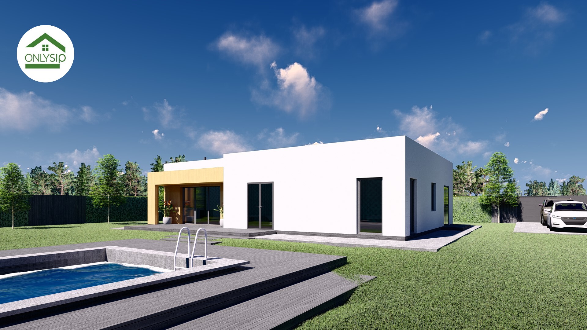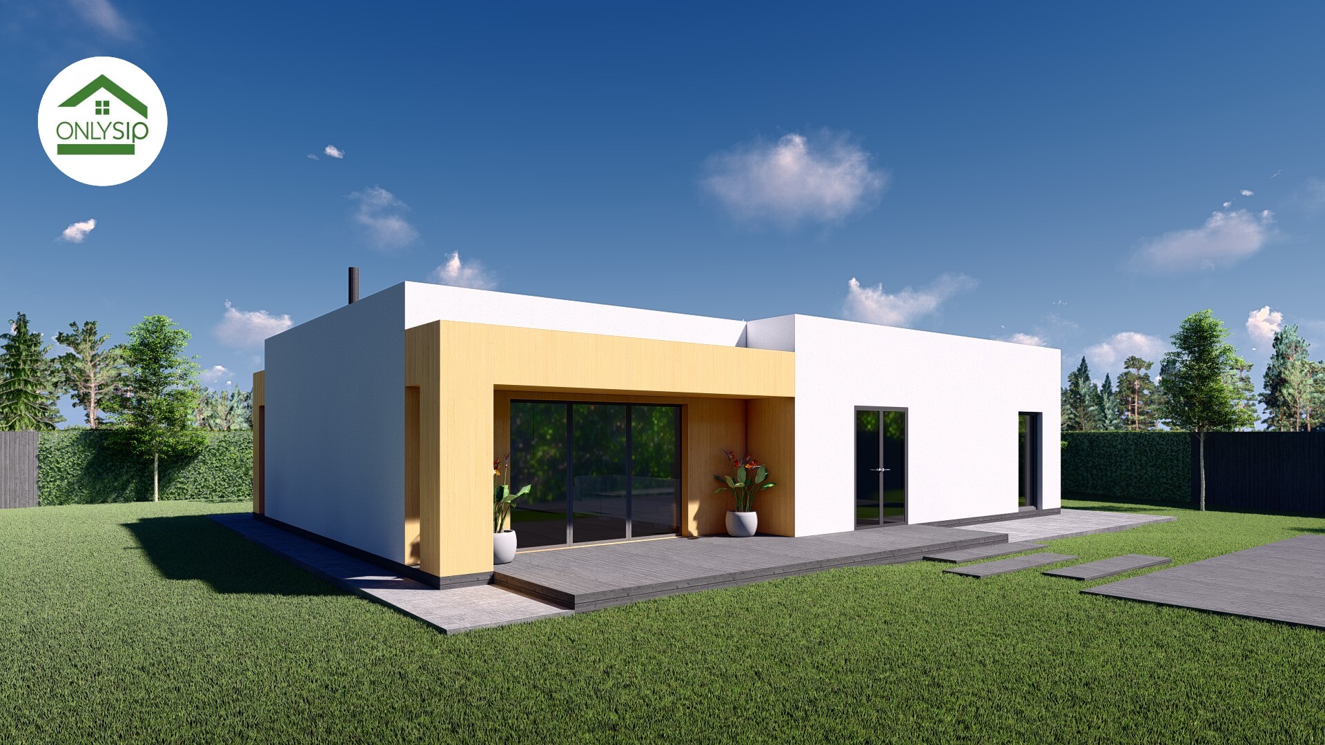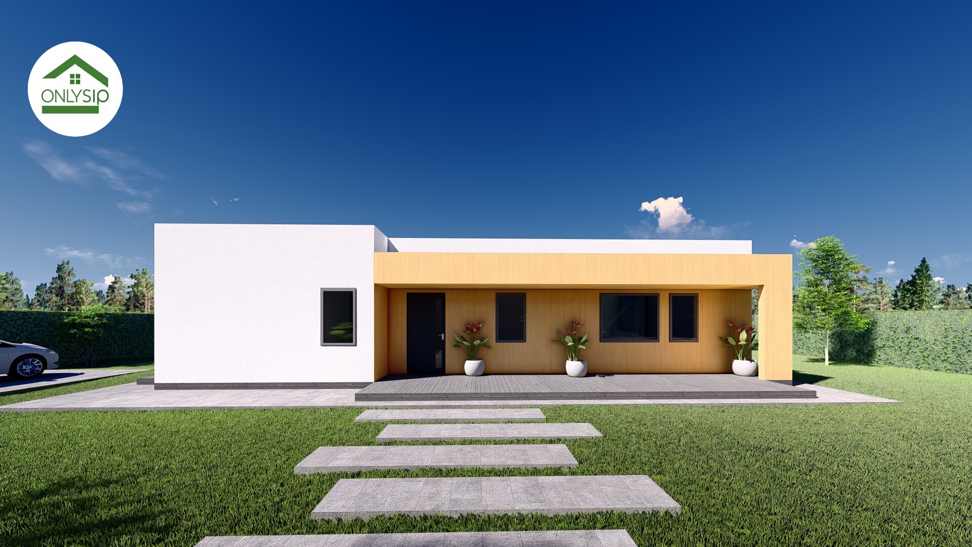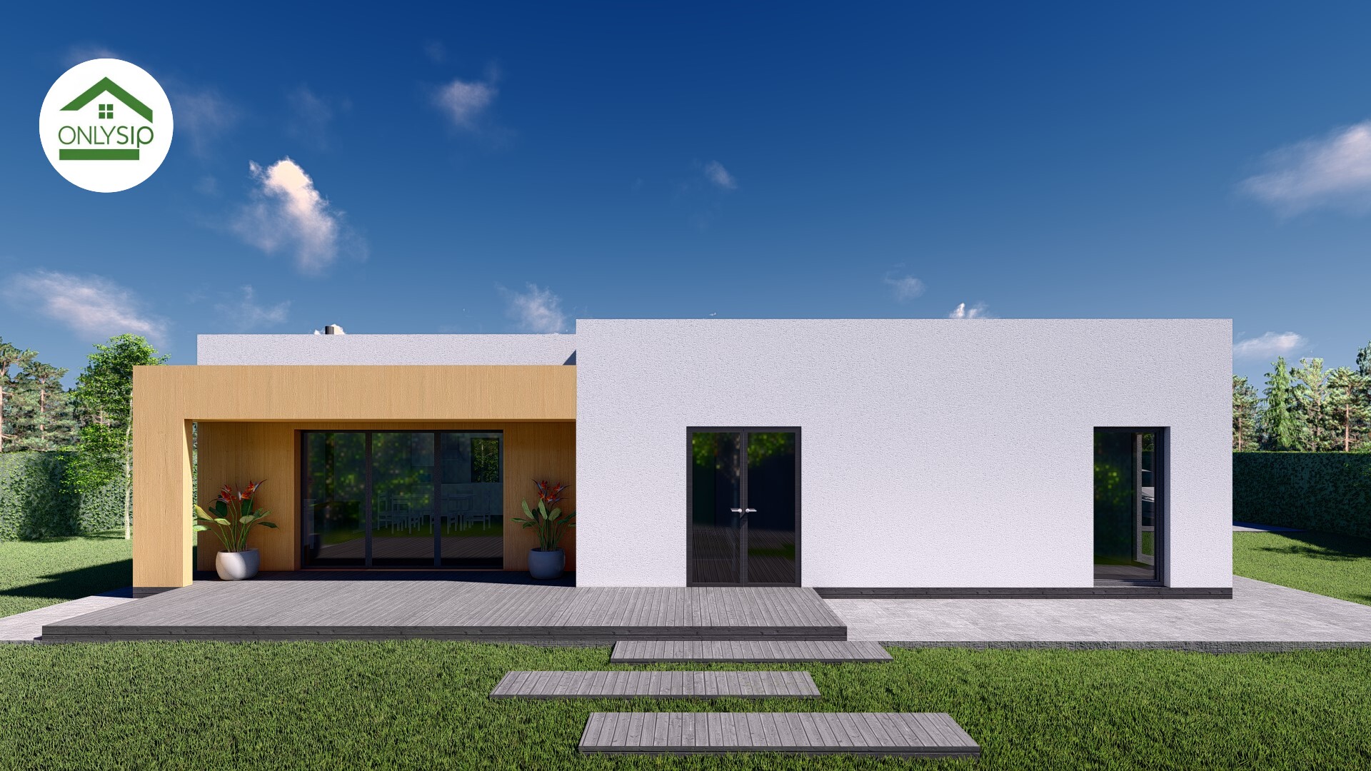 Цей проєкт — сучасний одноповерховий будинок від OnlySip, створений на основі енергоефективних SIP-панелей, що забезпечують стабільний мікроклімат та економію енергії. Архітектура виконана в мінімалістичному стилі з поєднанням білого тиньку та акцентних дерев’яних елементів, що надають будівлі теплий і сучасний вигляд. Центром будинку є простора кухня-вітальня площею понад 30 м² із панорамними вікнами, які наповнюють інтер’єр природним світлом. У проєкті передбачено три зручні спальні площею від 12 до 17 м², що підходять для сім’ї з дітьми або гостей. Домоволодіння включає два санвузли та функціональну пральну/господарську зону, що підвищує комфорт повсякденного життя.
