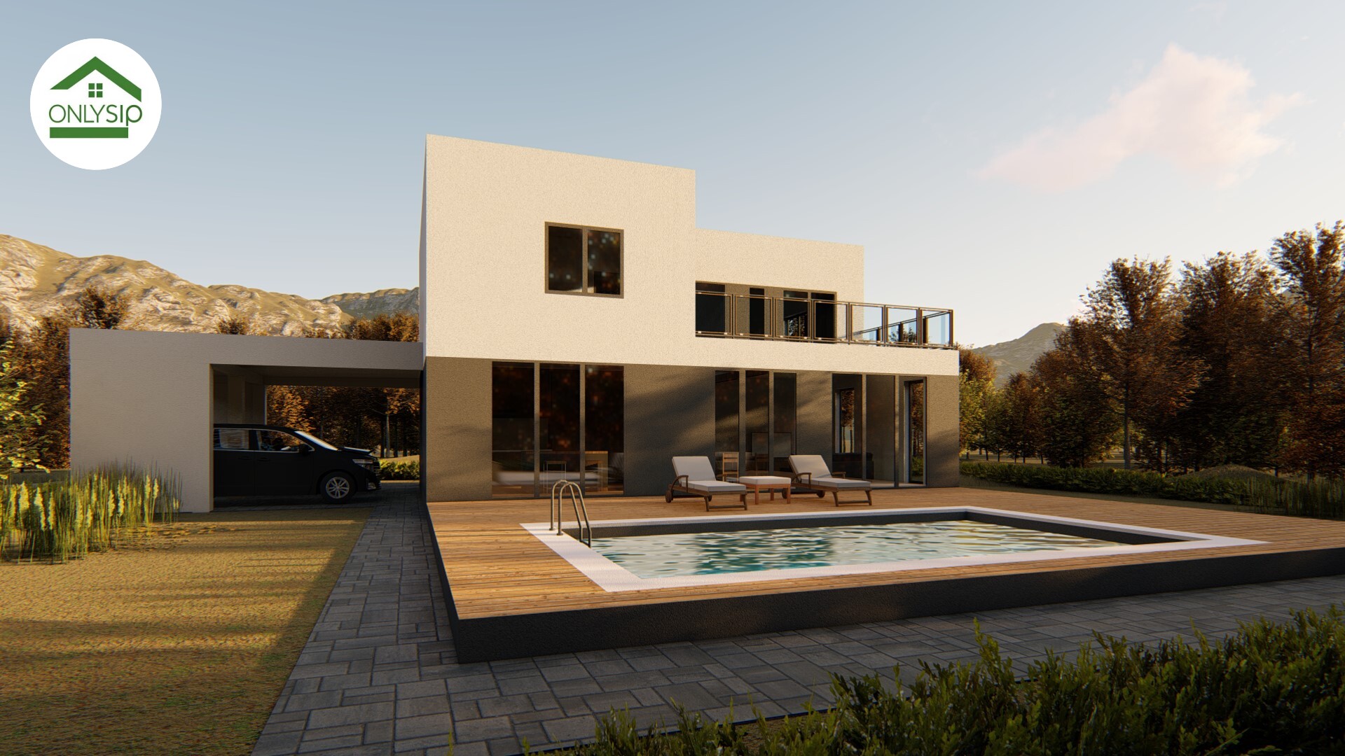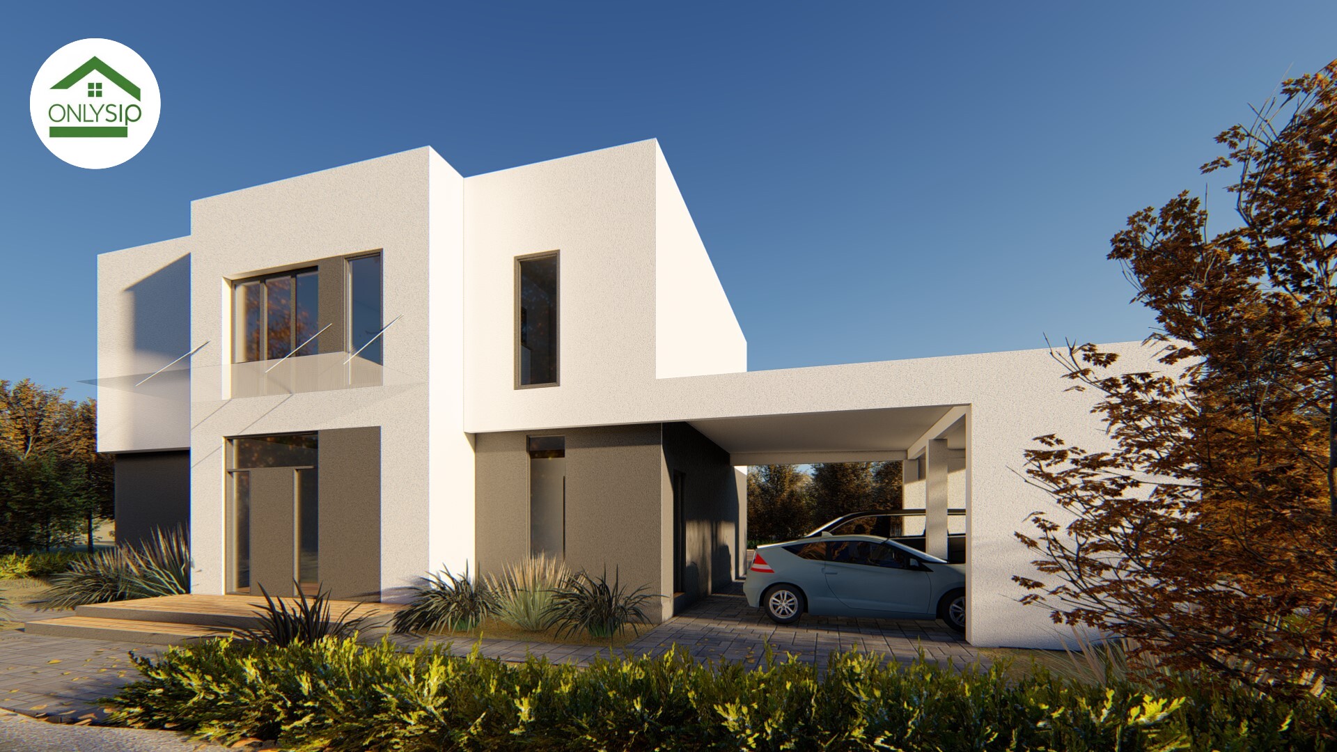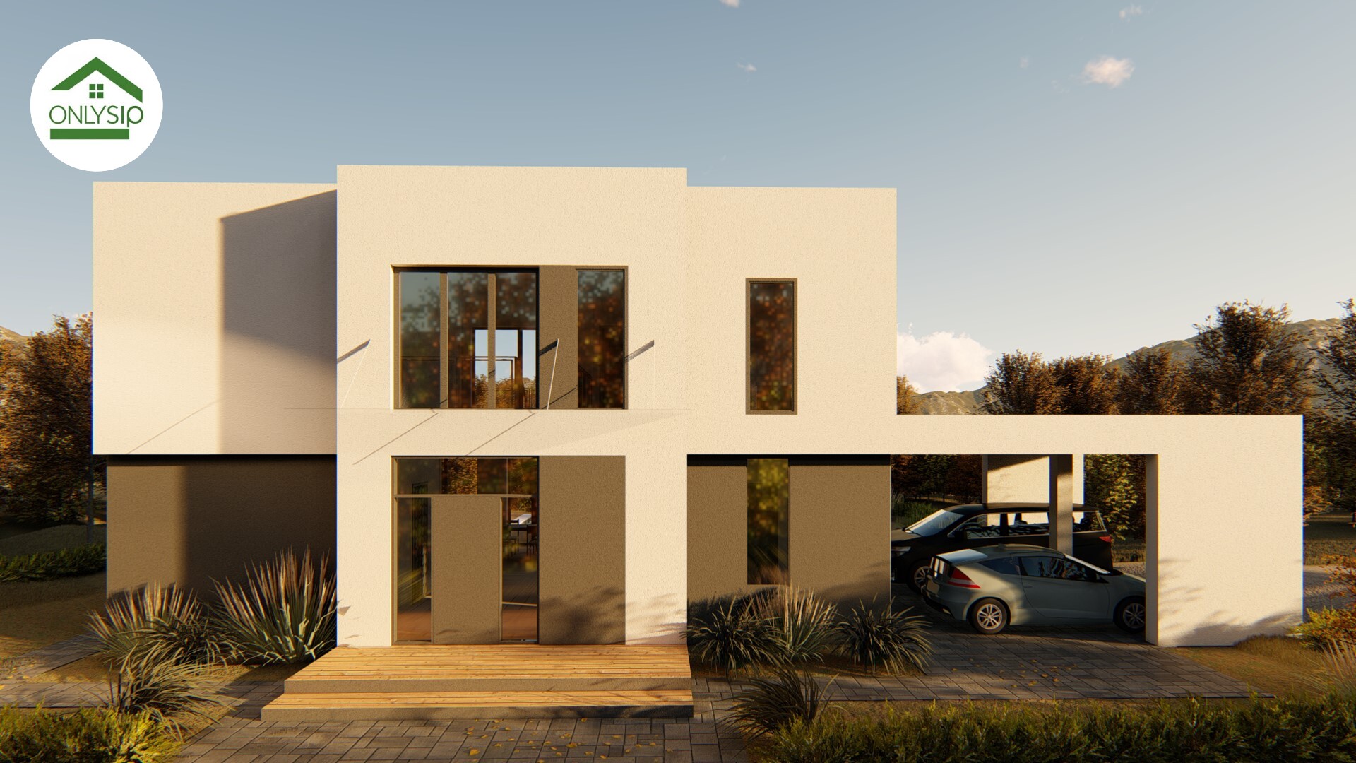Цей проєкт — сучасний двоповерховий будинок від OnlySip, створений із використанням енергоефективних SIP-панелей. Архітектура виконана в мінімалістичному стилі з прямими лініями, великими панорамними вікнами та контрастним поєднанням білого та графітового фасаду. На першому поверсі розташована простора вітальня-кухня площею понад 54 м², що забезпечує максимальне природне освітлення та комфорт для всієї родини. Тут також передбачено технічне приміщення, санвузол і зручний хол з виходом на терасу площею 32,66 м². На другому поверсі знаходяться дві великі спальні, гардеробна, ванна кімната та атріум, який відкриває додатковий простір і світло. З головної спальні є вихід на простору терасу площею 26,81 м², що ідеально підходить для ранкової кави або вечірнього відпочинку. Біля будинку розташовано навіс-парковку площею понад 30 м², що забезпечує зручність та захист автомобіля.