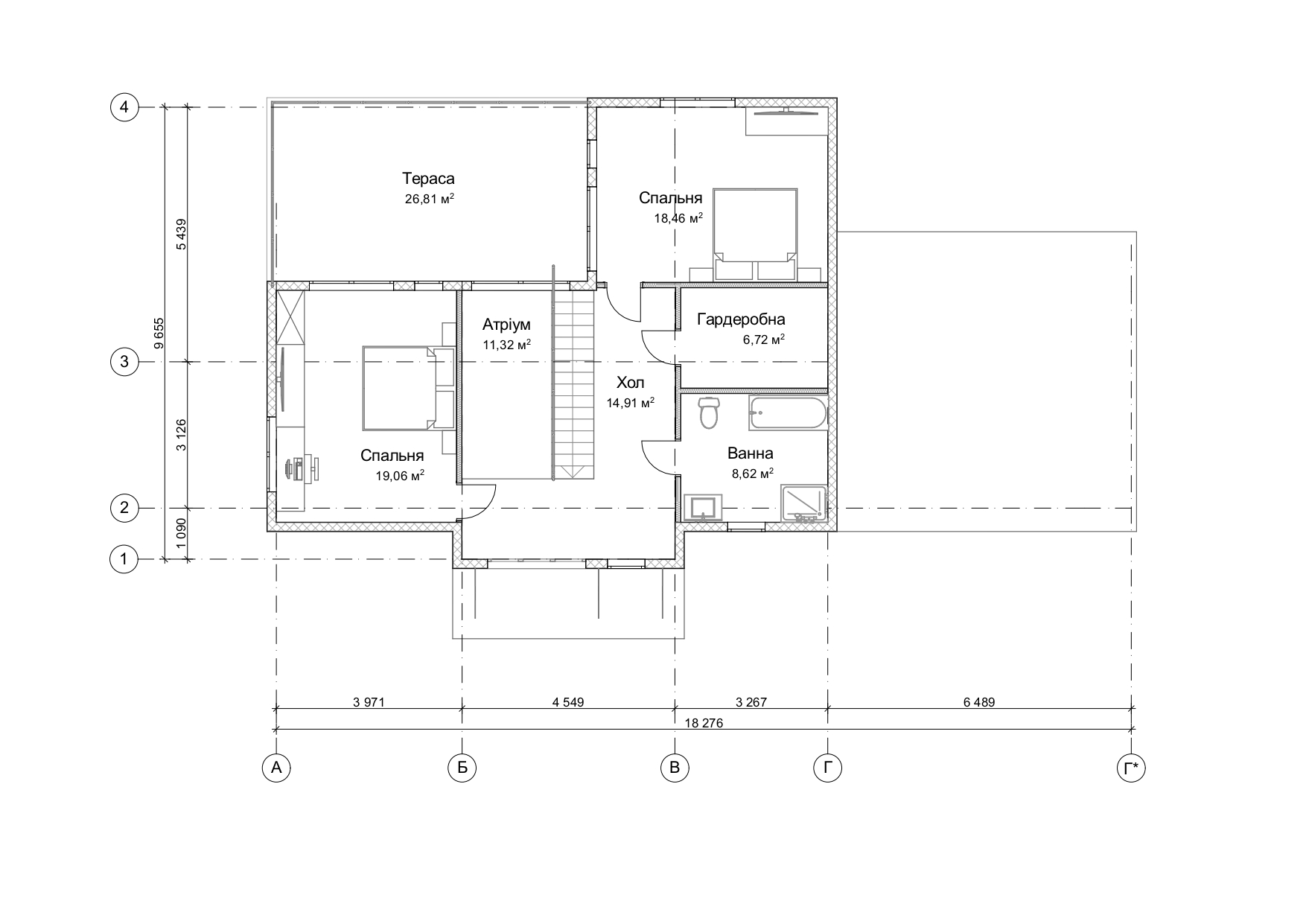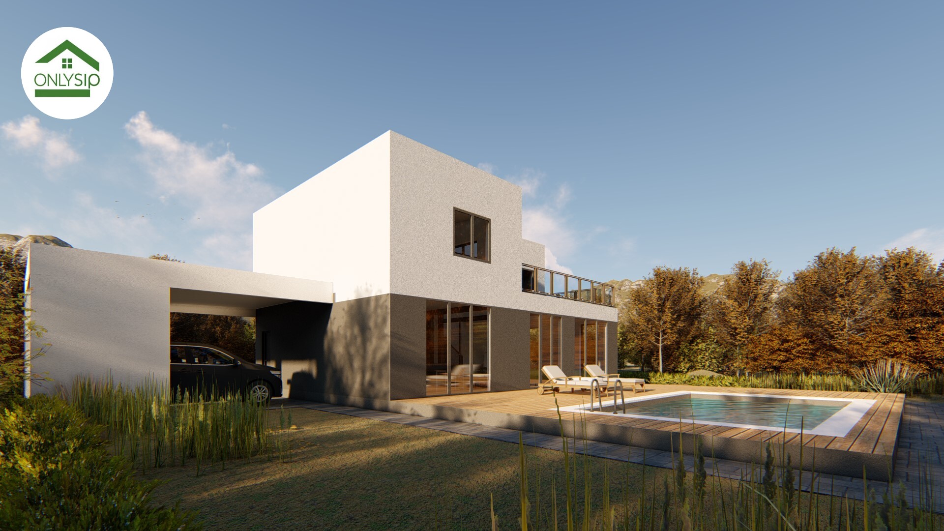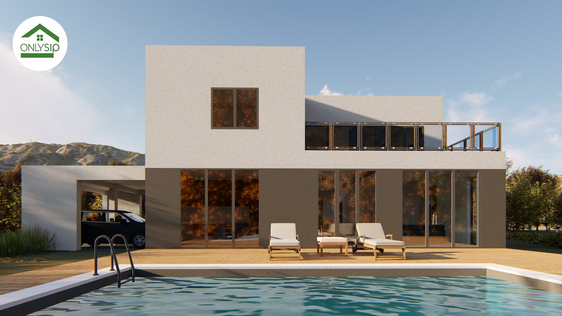 Цей проєкт — сучасний двоповерховий будинок від OnlySip, створений із використанням енергоефективних SIP-панелей. Архітектура виконана в мінімалістичному стилі з прямими лініями, великими панорамними вікнами та контрастним поєднанням білого та графітового фасаду. На першому поверсі розташована простора вітальня-кухня площею понад 54 м², що забезпечує максимальне природне освітлення та комфорт для всієї родини. Тут також передбачено технічне приміщення, санвузол і зручний хол з виходом на терасу площею 32,66 м². На другому поверсі знаходяться дві великі спальні, гардеробна, ванна кімната та атріум, який відкриває додатковий простір і світло. З головної спальні є вихід на простору терасу площею 26,81 м², що ідеально підходить для ранкової кави або вечірнього відпочинку. Біля будинку розташовано навіс-парковку площею понад 30 м², що забезпечує зручність та захист автомобіля.