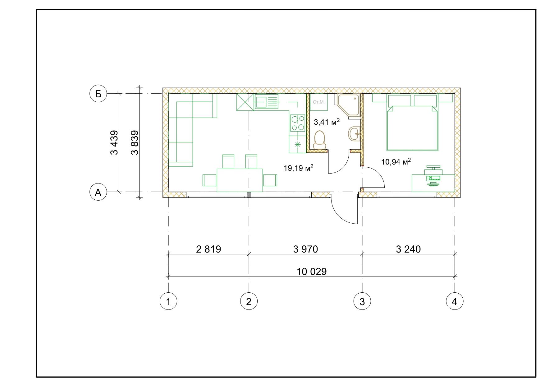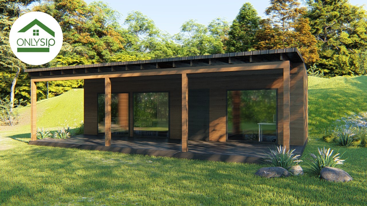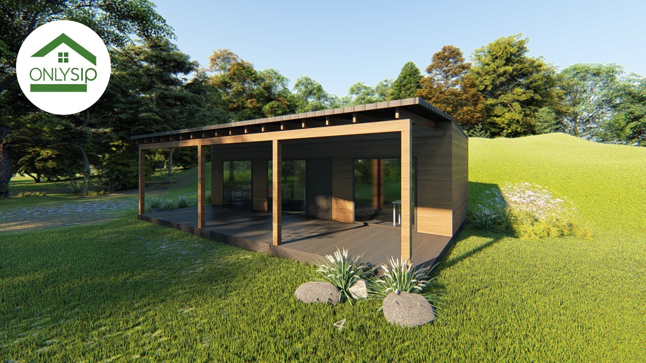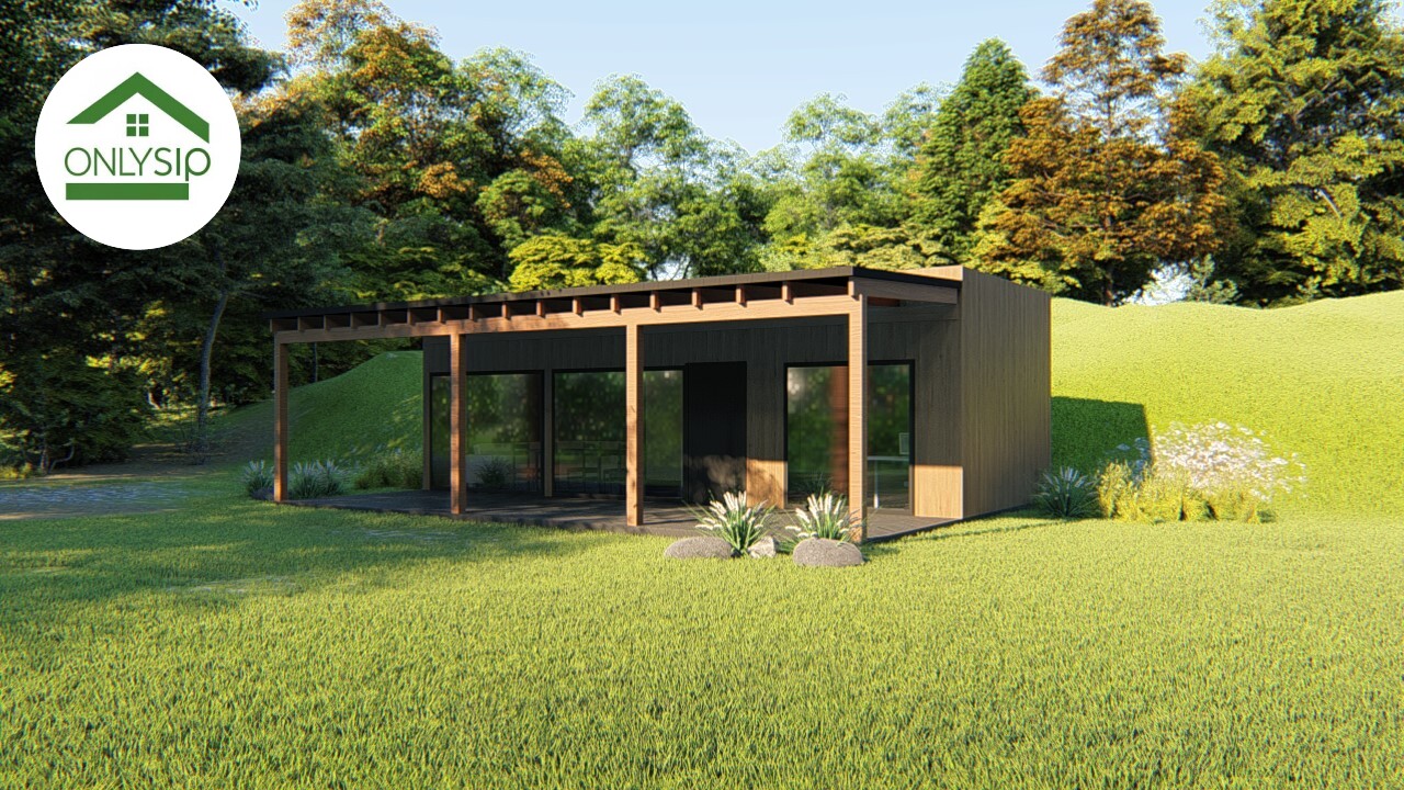Цей проєкт — сучасний одноповерховий будинок від OnlySip, створений із надійних та енергоефективних SIP-панелей. Мінімалістичний фасад із великими панорамними вікнами та широкою терасою формує атмосферу простору й природного світла. Центральною зоною є кухня-вітальня площею 19,19 м², яка поєднує комфорт, функціональність і зручне планування. Поруч розташовано спальню площею 10,94 м² — затишне приватне місце для відпочинку. Санвузол на 3,41 м² продуманий так, щоб забезпечити повноцінний побут навіть у компактному форматі. Велика накрита тераса створює додатковий житловий простір для релаксу, барбекю чи роботи на свіжому повітрі.
